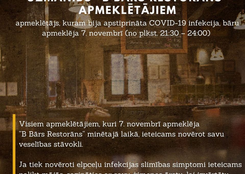 Visiem apmeklētājiem, kuri 7.novembrī apmeklēja "B Bārs Restorānu" minētajā laikā, ieteicams novērot savu veselības stāvokli. Ja tiek novēroti elpceļu infekcijas slimības simptomi, ieteicams palikt mājās un sazināties ar savu ģimenes ārstu, lai izvērtētu veselības stāvokli.